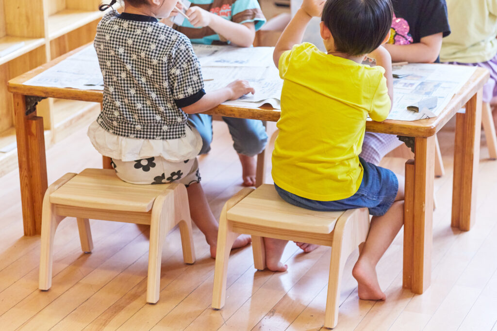 食事のシーン、お絵描きや積み木遊びなど遊びのシーン、様々な時間で机と椅子は、園児の時間に欠かせません。