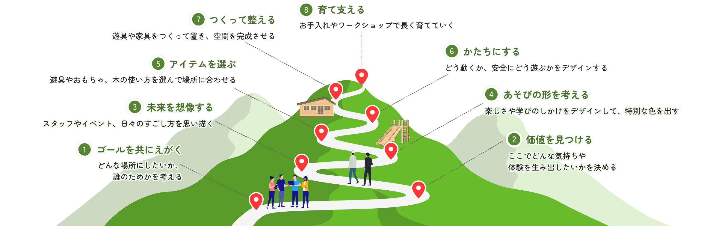 わたしたちは、施設整備の目的、対象年齢、運営方法など、軸となる考え方を整理したうえで、ちょっとした遊び心を加えた、