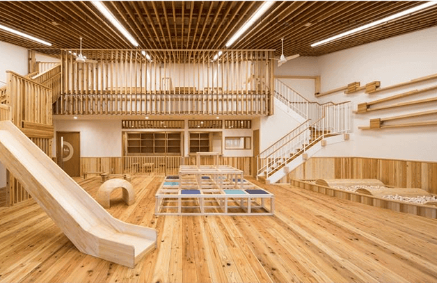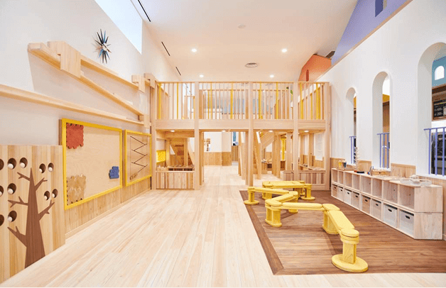 オリジナル造作大型遊具(ジャングルジムなど)・家具、アトリエコーナー、探究コーナー、おもちゃコーナー、絵本コーナー等