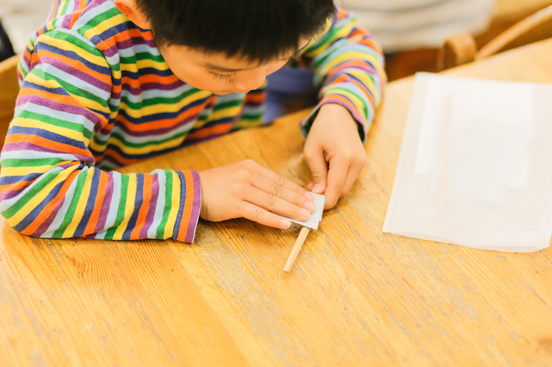 作る前に、自分が普段使っている箸をよく見てみましょう。先端に行くほど細くなっていて、先端の3センチの食い先は2本がピッタリ合うように作られています。 箸にもいろいろ種類があります。細い箸、太い箸、四角い箸、丸い箸……。自分が作りたい箸のカタチに近いものを観察してみましょう。